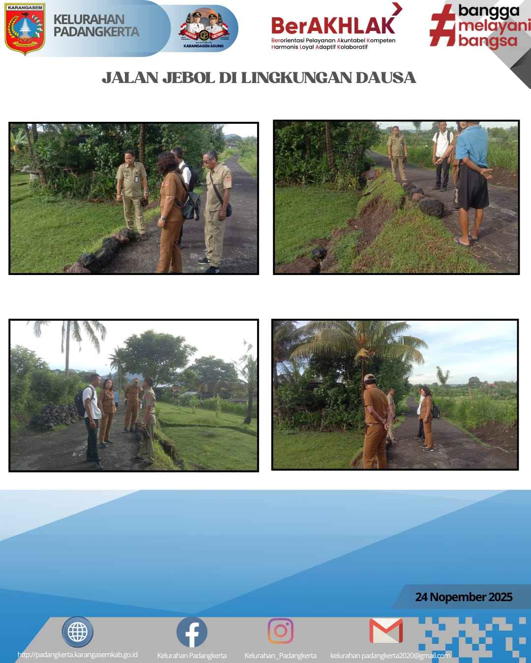 lurah beserta kasi pembangunan melakukann pengecekan langsung Pada lokasi tersebut ditemukan kondisi jalan jebol dengan kerusakan sedang. Kerusakan terjadi akibat erosi aliran air karena drainase tidak berfungsi sehingga menyebabkan pinggiran beton jebol. Kondisi ini sedikit mengganggu aktivitas masyarakat karena jalan menjadi tidak aman dilewati, terutama bagi kendaraan roda empat.