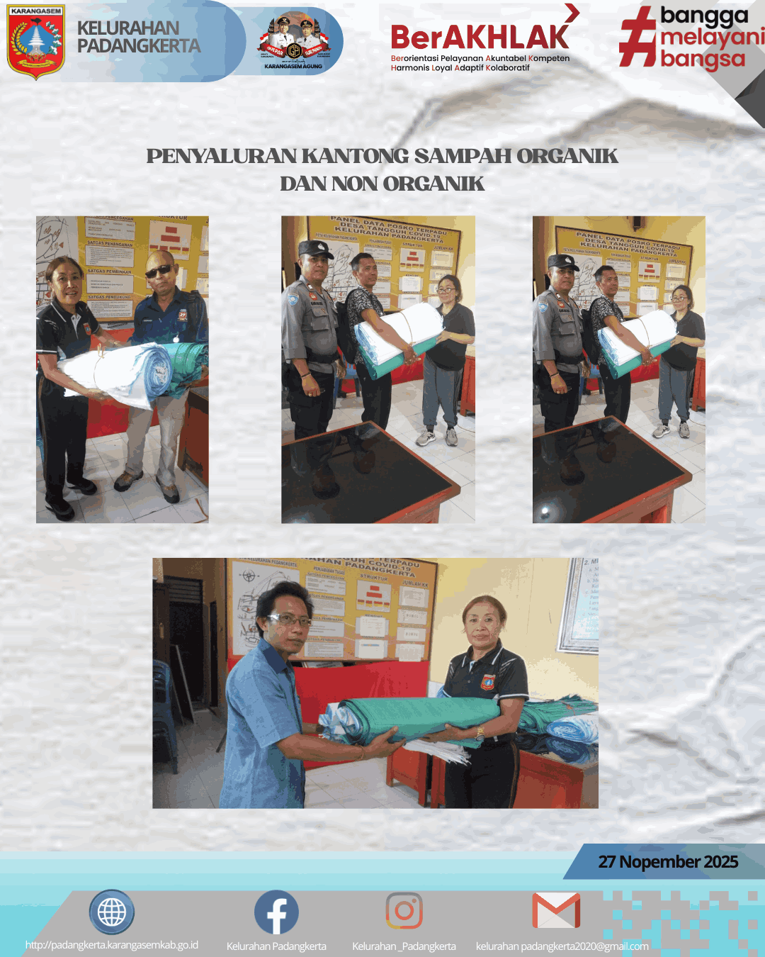Kegiatan Penyaluran Kantong Sampah Organik dan Non Organik dilaksanakan sebagai upaya meningkatkan kesadaran masyarakat dalam pengelolaan sampah sejak dari sumbernya. Program ini bertujuan untuk mendorong pemilahan sampah rumah tangga sehingga pengelolaan lingkungan menjadi lebih tertib, bersih, dan berkelanjutan. Penyaluran dilakukan kepada masyarakat di wilayah sasaran melalui Kepala Lingkungan Se Kelurahan Padangkerta sejumlah 2.500 kantong sampah tersebar di 13 lingkungan. Setiap rumah tangga menerima dua jenis kantong sampah, yaitu: 1. Kantong Sampah Organik Digunakan untuk menampung sisa makanan, daun, dan jenis sampah yang mudah terurai. 2. Kantong Sampah Non Organik Digunakan untuk menampung plastik, kertas, dan sampah yang tidak mudah terurai.